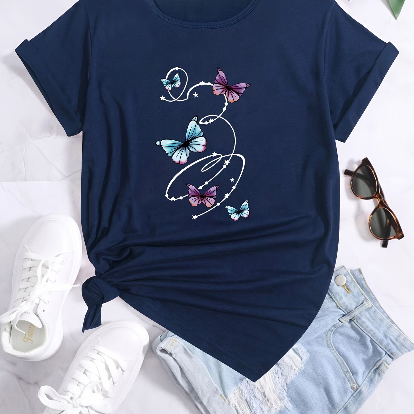 TEMU 나비 패턴 캐주얼 티셔츠, 라운드 넥 반팔 스포츠 티, 여성용 편안한 상의 그래픽
