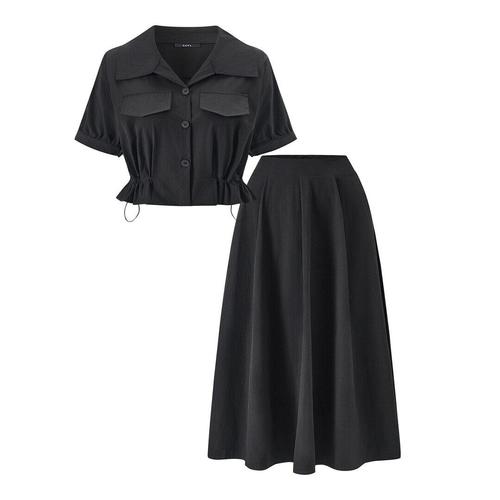 [GGPX]데일리 오픈카라 스트링 반팔 셔츠 롱 스커트 셋업 (GQBOW011D)