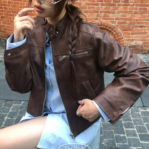 더핑크 / 이칸 세미크롭 빈티지 바이커 레더 자켓