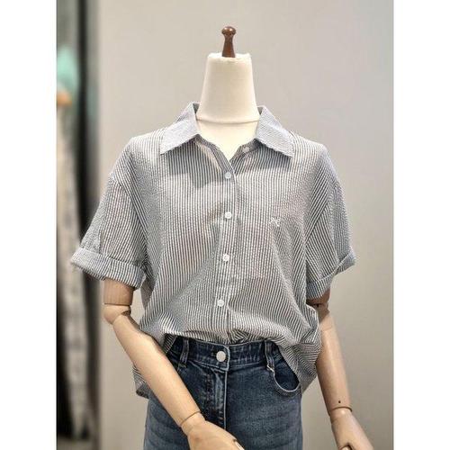 [옷자락]여자 코튼 스트라이프 소매 롤업 오버핏 반팔 남방_3