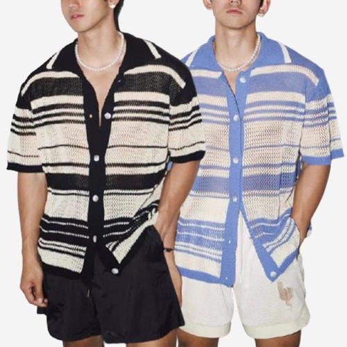 [아이에스이랩]레트로 스트라이프 니트 셔츠 반팔 가디건 I2TS078