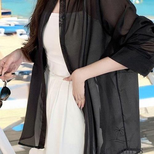 [에이치플러스몰]모리셔츠 비치웨어 카라 시스루 블랙 셔츠 커버업 긴팔 여름 데일리 남방 심플 빅사이즈..