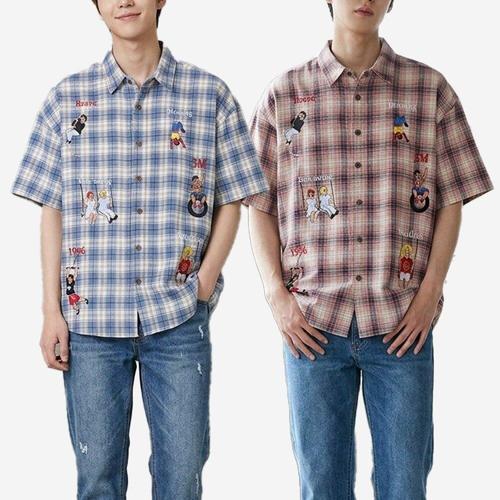 [아이에스이랩]오버핏 자수 포인트 여름 반팔 체크 남방 I2SH020