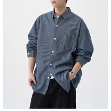 POMTOR 가을 남성 워싱 데님 스트라이프 배색 긴팔 루즈핏 캐주얼 셔츠