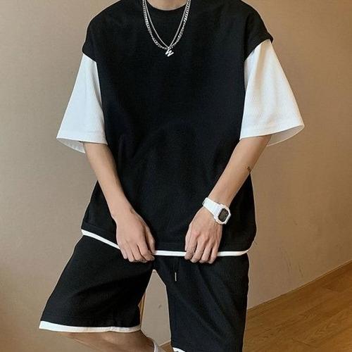 1+1 2p 여름 와플 반팔티 남성용 레이어드 루즈핏 5부 티셔츠 얇은 통기 시원한 라운드 무지 상의
