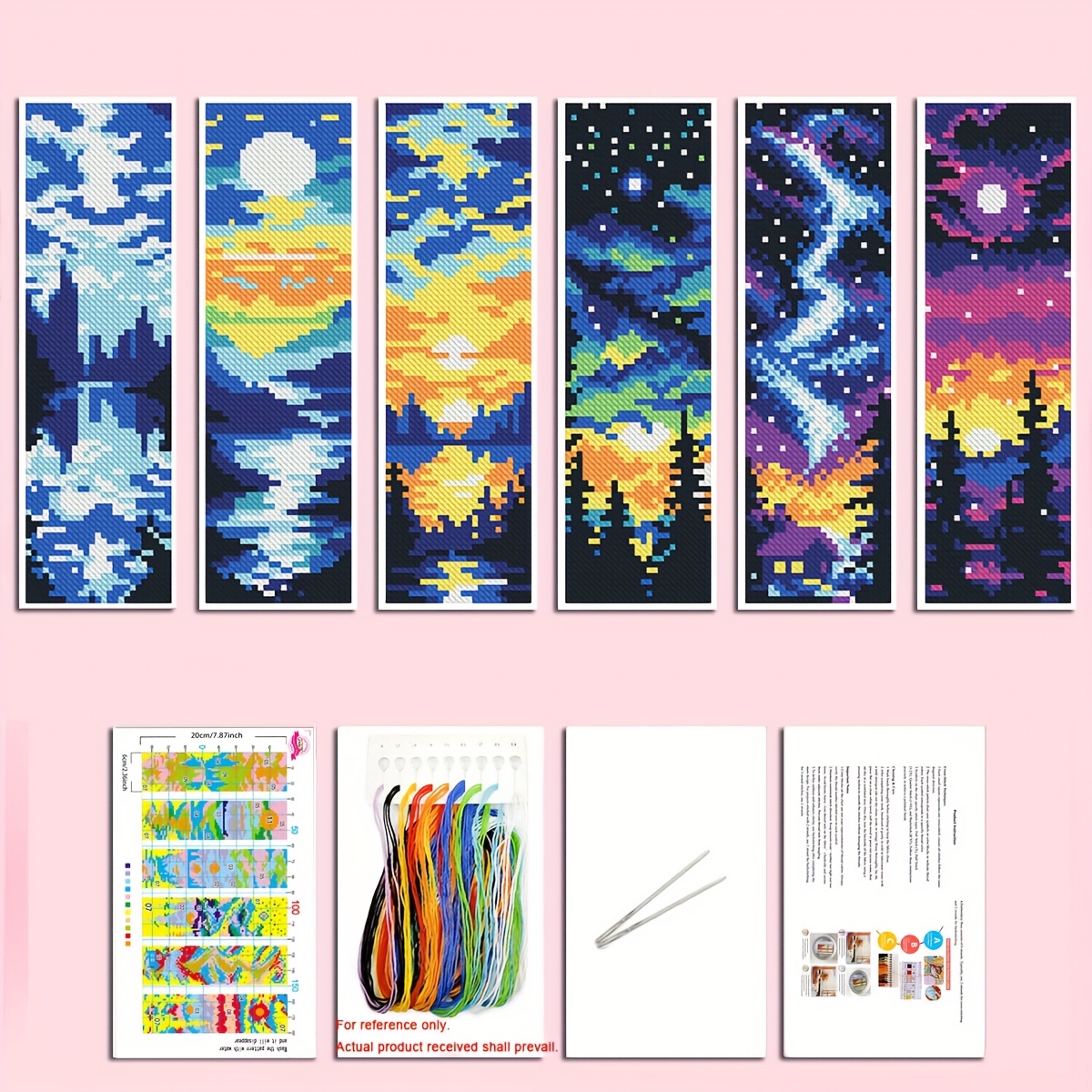 TEMU 1세트 프린트 크로스 스티치 키트 (북마크 6개 포함) - 타임 랜드스케이프 레코드 DIY 아트 세트, 선셋, 산, 별이 빛나는 하늘 디자인 북마크 세트, 11CT 미디엄 그리드 크로스 스티치, 3겹 실 포함, 초보자와 공예 애호가를 위한 크로스 스티치 장식, 홈 데코 또는 선물용