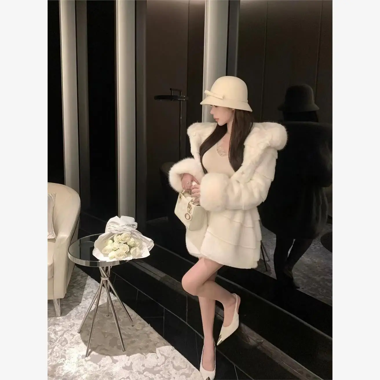 두꺼운 모피 재킷 여성용 2025년 신상 중간 길이 젊은 스타일 친환경 밍크 벨벳 여우털 칼라 후드 가죽 모피