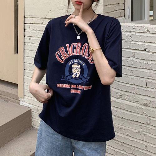 여성 루즈핏 반팔 티셔츠 여름 프린팅 티 네이비 WFK5LCW