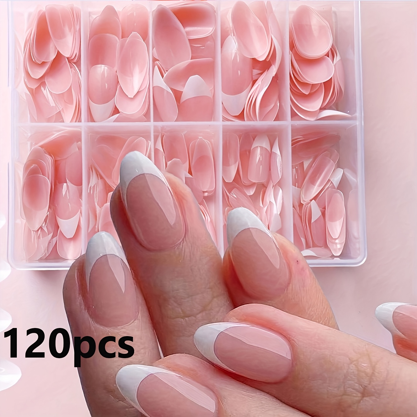 TEMU 120개입 박스형 네일 세트 누드 핑크 & 화이트 프레스온 네일 아몬드형 미디엄 길이 광택 마감 - 여름 솔리드 컬러 네일, 손발용, 살롱 퀄리티 쉬운 적용, 귀여운 네일, 뷰티 액세서리, 매끄러운 표면 네일