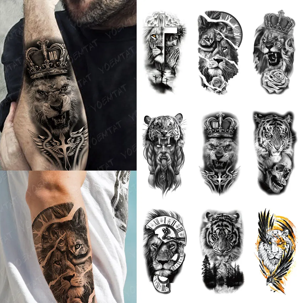 크로스 라이온 방수 임시 문신 스티커 크라운 장미 꽃 호랑이 늑대 전사 바디 아트 팔 가짜 문신 슬리브 여성 남성