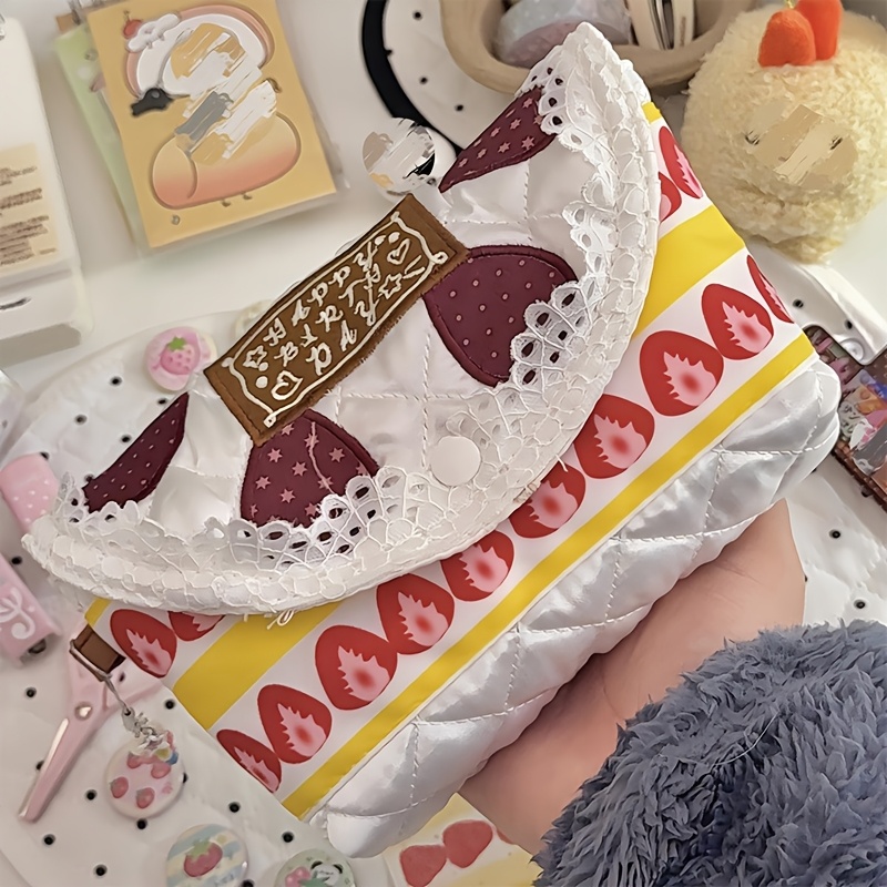 TEMU 한국식 "딸기 레이스 케이크" 메이크업 파우치 - 귀여운 "딸기 케이크" 패턴 화장품 파우치, 자수 패치워크 수납 가방, 다층 구조 휴대용 파우치, 일상 외출 및 여행용으로 적합