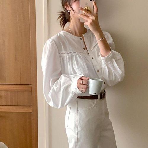 긴팔 블라우스 펀칭 셔츠 퍼프소매 노카라 디자인 WFLACV1