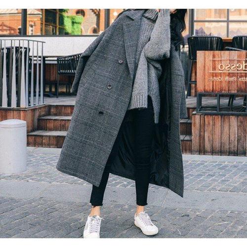 여성 추동 롱 체크 코트 데일리 통근 루즈핏 캐주얼 모직 도톰 코트 슬림소녀