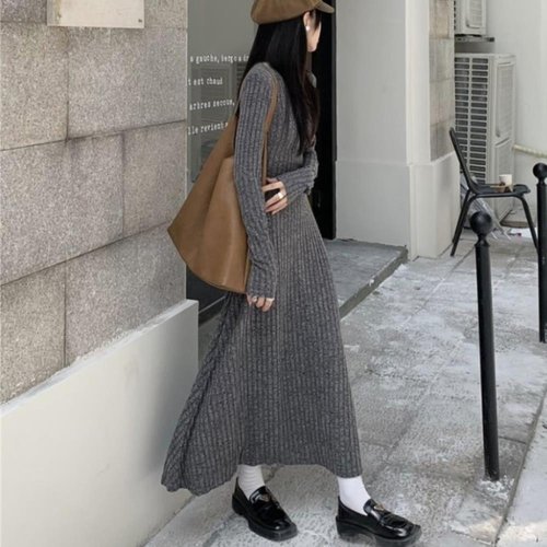 [옷자락]여성 골지 롱 니트 원피스 단추 포인트