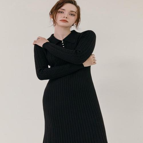 시크힐즈 심플 카라 진주버튼 긴팔 니트 원피스 00276 T