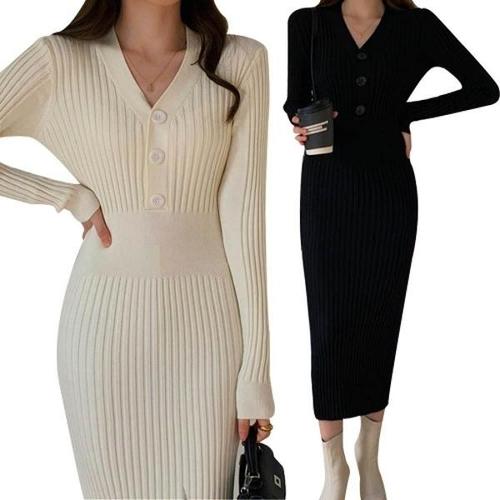 [엄지척]여성 브이넥 슬림핏 단추 니트 롱원피스 골지원피스_19911689_667501