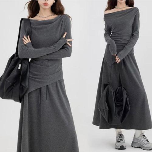 언발 롱 스커트 플레어 치마 긴팔 오프숄더 니트 세트 WFKZ8S3