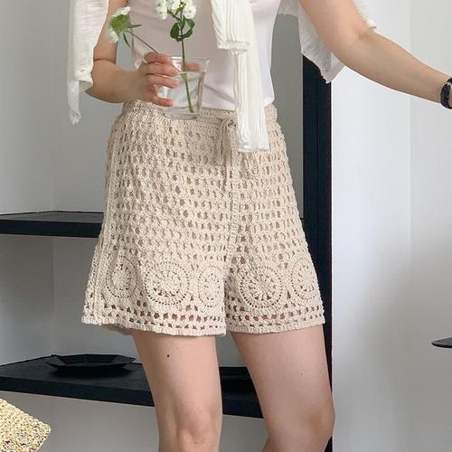 여자 펀칭니트 스카시 리본 밴딩 피서룩 반바지