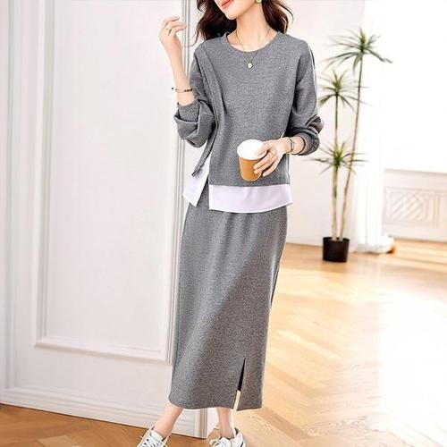 페이퍼먼츠 라운드넥 니트 티셔츠 + 롱 스커트 세트 23095