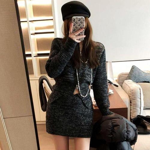 [에이치플러스몰]윈터무드 니트 세트 스커트 페미닌룩 집업 보카시