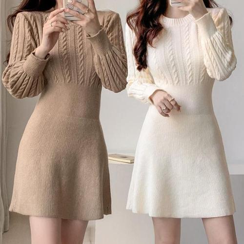 꽈배기 밴딩 허리 원피스 여자 플레어 미니 니트 긴팔 WFLQ841