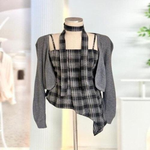 [스타일리쉬바이피클]체크 비대칭 슬리브리스 숏 니트 가디건 세트