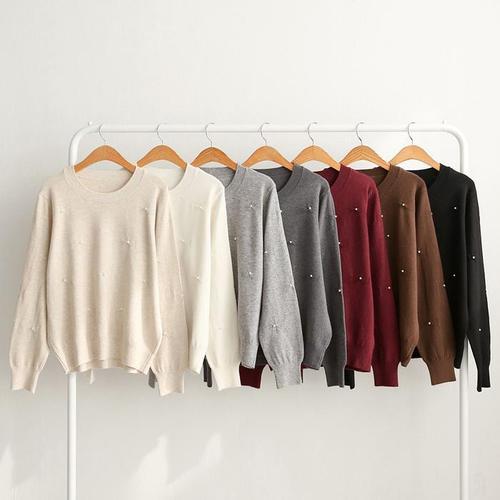 여성용 진주 리본 U넥 장식 귀여운 와인 니트