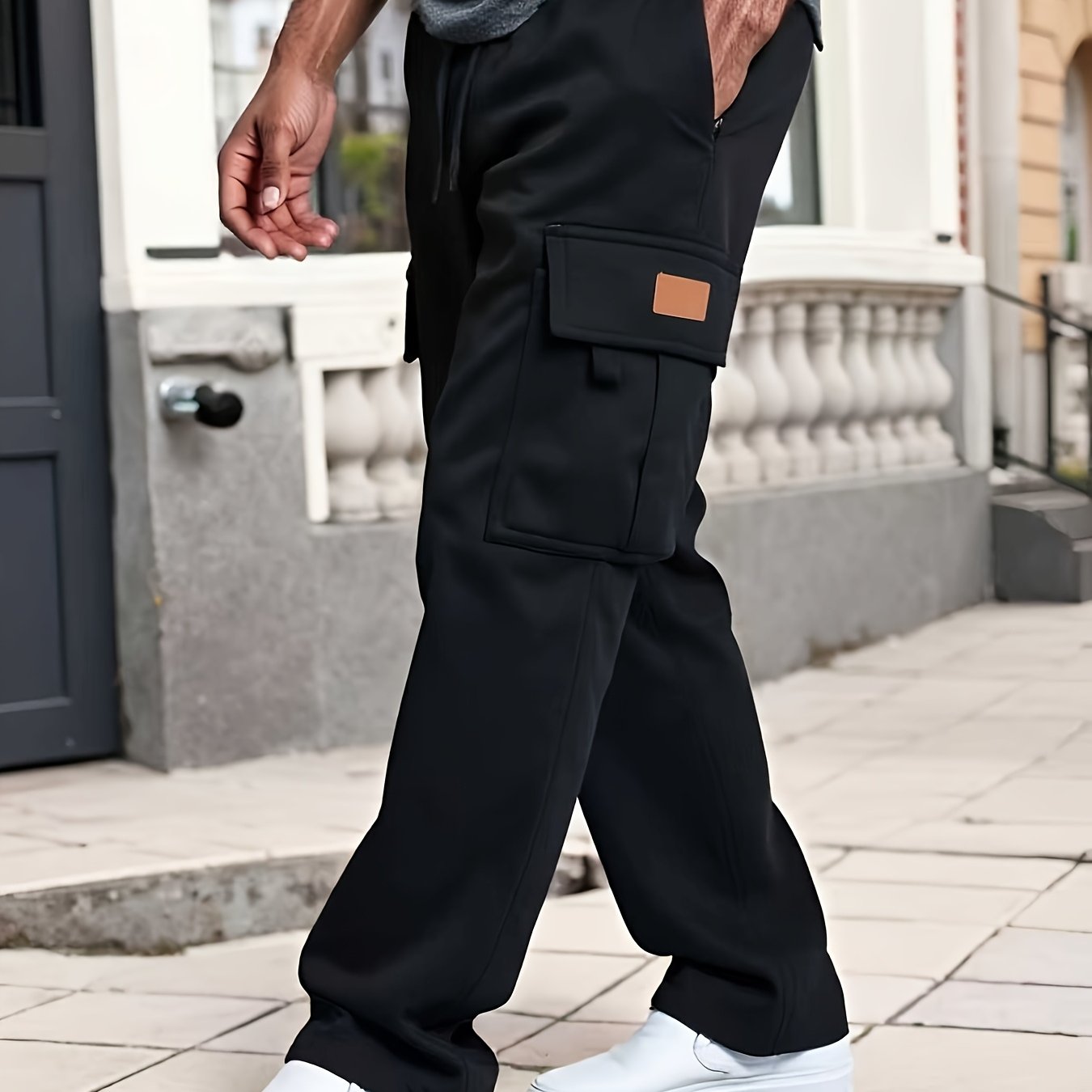 TEMU 남성용 블랙 루즈핏 카고 바지, 대형 포켓 및 가죽 라벨, 드로스트링 장착