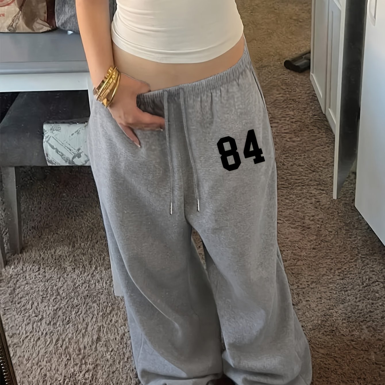 TEMU 특별한 의미를 지닌 행운의 숫자 "84" 프린트가 특징인 여성용 트렌디하고 쿨한 의상, 니치 스타일 프린트 드로스트링 허리 루즈핏 팬츠. 캐주얼, 여성스러운, 집에서 입는 옷, 데일리 외출용, 가을/겨울용으로 활용 가능한 안감 있는 다용도 트라우저/스웨트팬츠