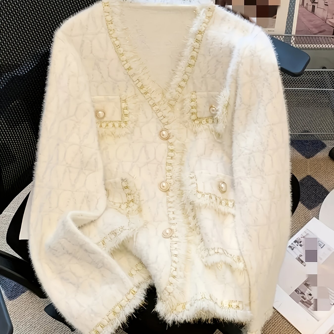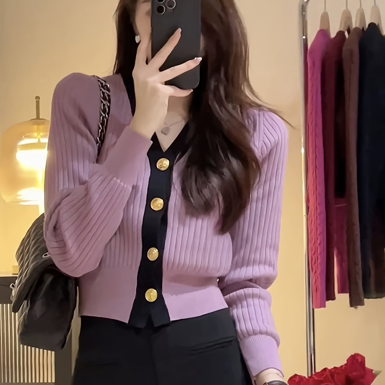 TEMU 탈리스먼드 밑단 퍼지 버튼 프론트 가디건, 우아한 대조 트림 V넥 긴팔 가디건 - 여성용 가을 겨울 의류