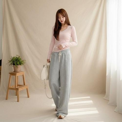 [다잇템][다잇템] 여성 골지 V넥 슬림핏 단가라 레이스 긴팔티_24750841_588872