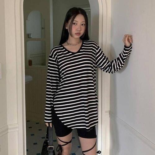 여름 코디 스트라이프 브이넥 반팔 티 상의