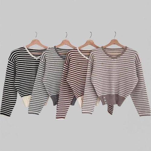 [신상오픈런]여자 단가라 브이넥 펜던트 배색 버튼 크롭 겨울 니트