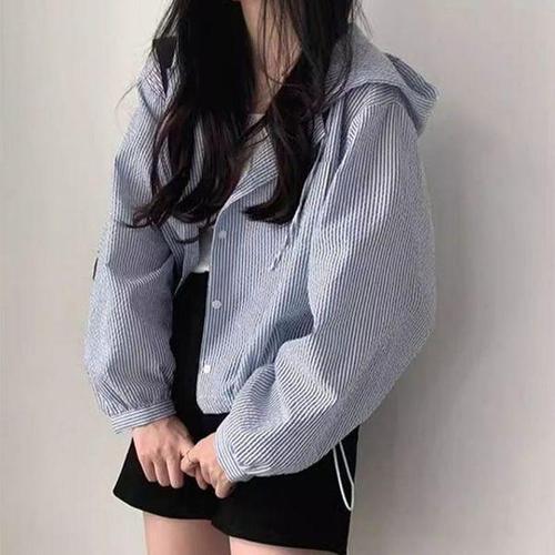 [에이치플러스몰]여성 루즈핏 세미크롭 스트라이프 후드 셔츠