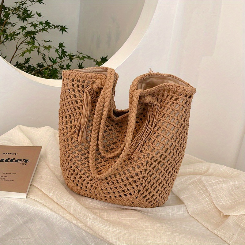 TEMU 프린지 디테일이 있는 수제 크로셰 토트 백 - 베이지 & 브라운 디자인, 여성용 대용량 숄더 백, 일상적인 사용에 적합, 손세탁 또는 드라이클렌, 다용도 캐리올, 장식용 폼퐈, 내부는 천으로 안장