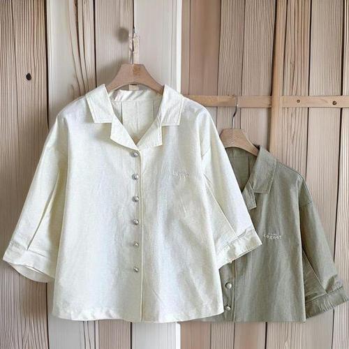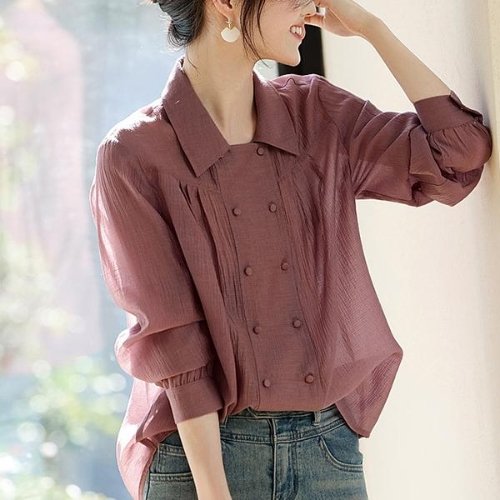 [신상오픈런]여성용 둥근 버튼 더블 카라 하프 소매 나일론 블라우스