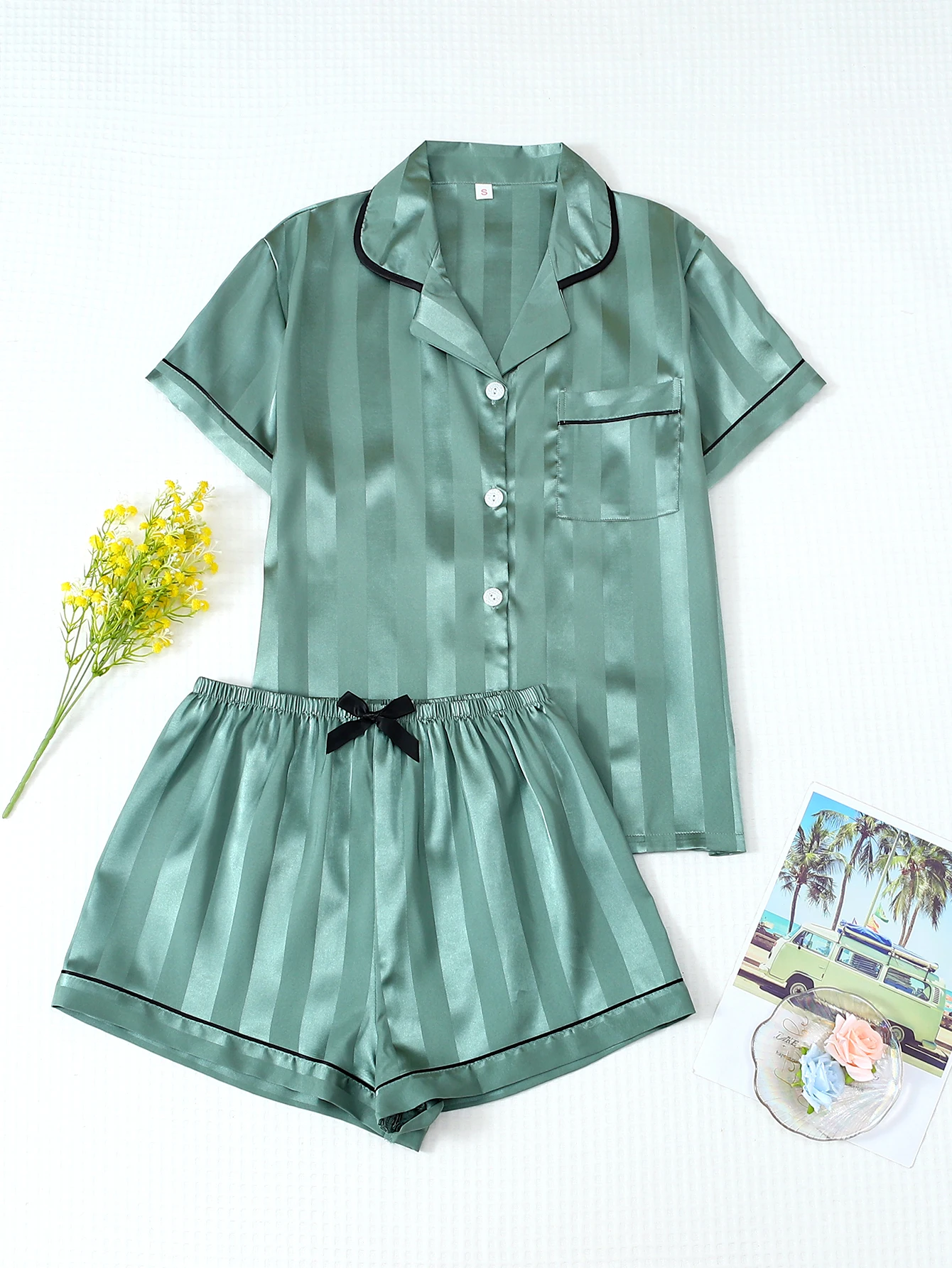 투피스 새틴 스트라이프 라펠 반소매 상의와 주머니가 있는 리본 반바지 여성용 파자마 라운지웨어 세트 가정용 적합