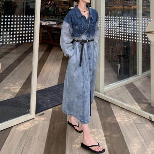 POMTOR 여자 가을 데님 원피스 셔츠 롱 원피스