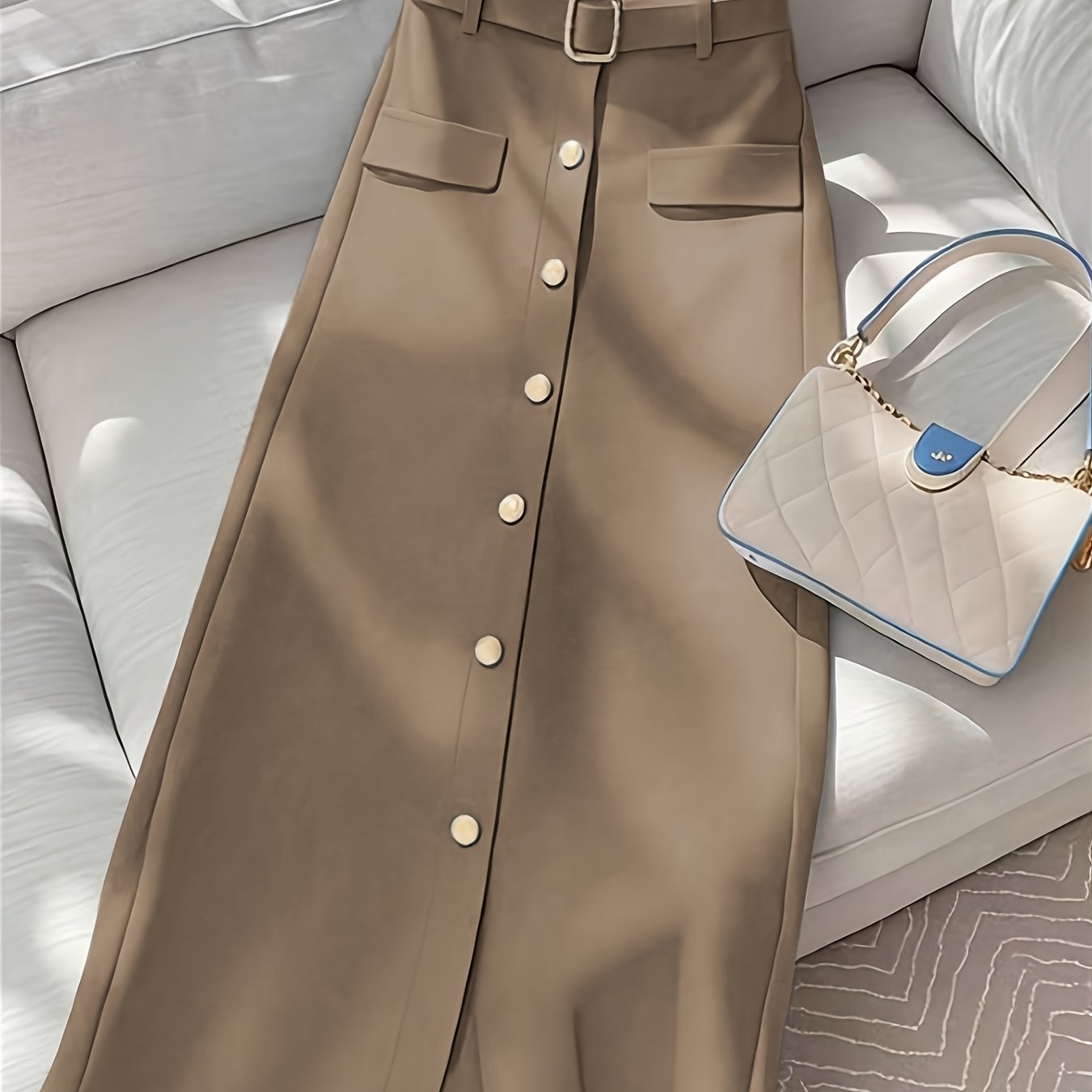 TEMU 신상 여성용 하이웨이스트 A라인 미디 스커트, 앞면 버튼, 벨트 장식, 캐주얼 및 출퇴근에 적합, 빈티지 스타일