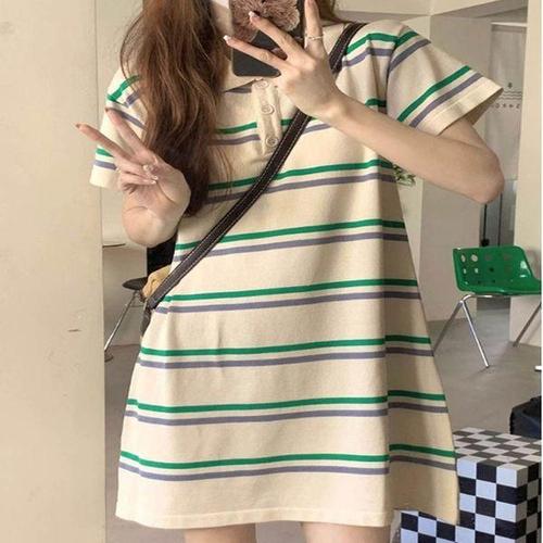 [에이치플러스몰]반팔 미니원피스 카라 스트라이프 여름 데일리룩 꾸안