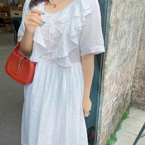 ZAJA 여성 봄여름 쉬폰 프릴 원피스 화이트 V넥 슬림핏 데이트룩