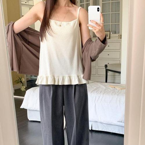 [신상오픈런]여성 프릴 도트 나시 빅사이즈 신축성 골지 끈 이너티