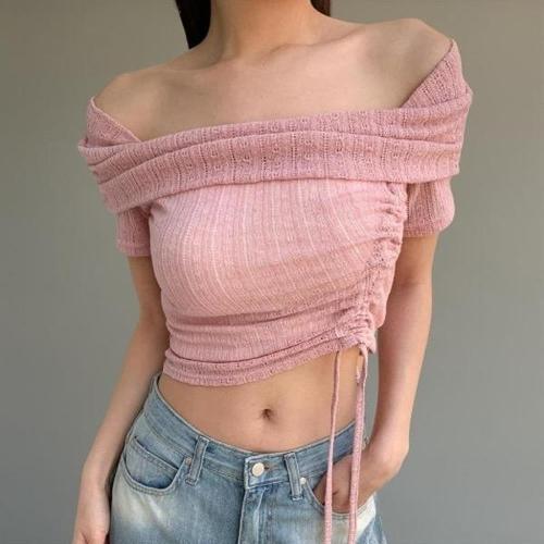 [신상오픈런]여성 독특한 레이온 시스루 오프숄더 숏 니트 스트랩