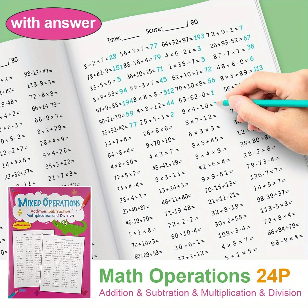 3~4학년을 위한 수학 학습서 혼합 연산(답변 포함), 덧셈, 뺄셈, 곱셈, 나눗셈 연습 시험 도서
