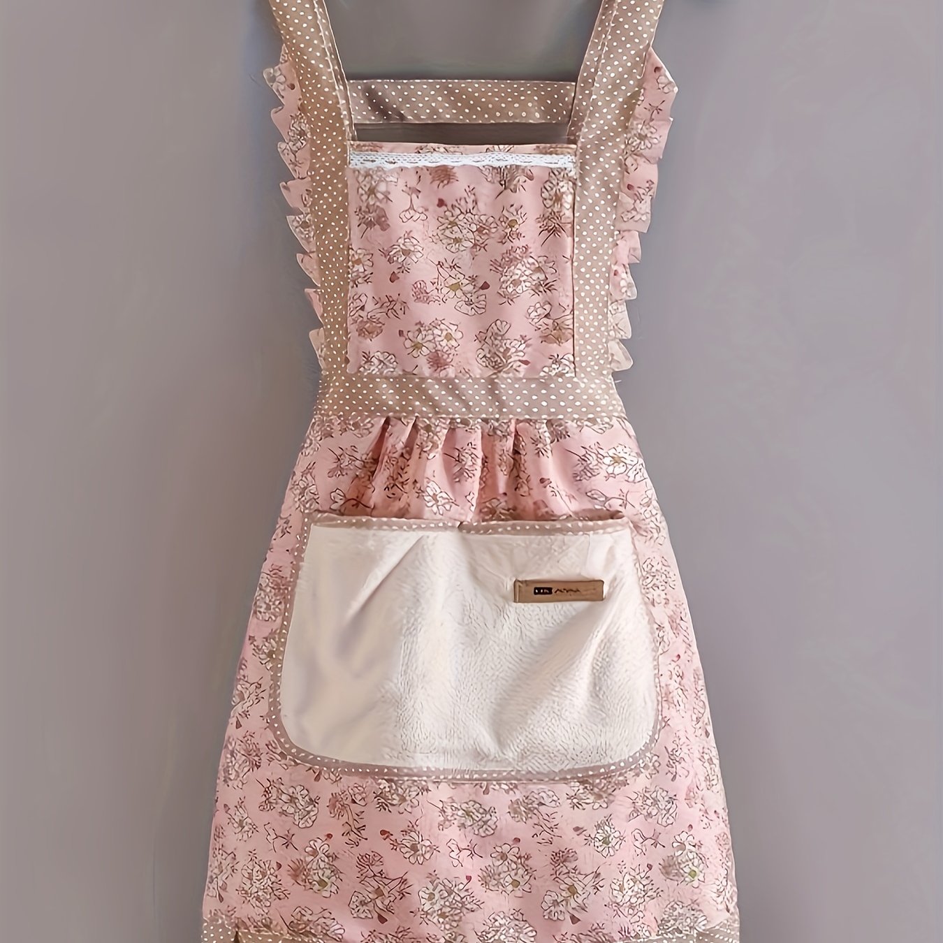 TEMU 손으로 닦을 수 있는 기능이 있는 우아한 꽃무늬 주방 앞치마 – 통기성 폴리에스터, 러플 엣지와 큰 포켓이 있는 귀여운 공주 스타일, 세탁기 사용 가능, 가정용 작업|매력적인 디자인|광택 있는 원단