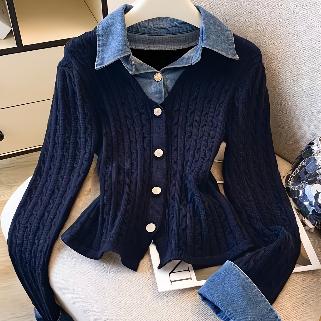 TEMU 여성용 로얄 블루 데님 패치워크 페이크 2피스 스웨터 패셔너블 데님 칼라 상의, 로얄 블루 케이블 가디건, 여성용 로얄 블루 케이블 가디건, V넥 데님 패치워크 상의, 핫 로얄 블루