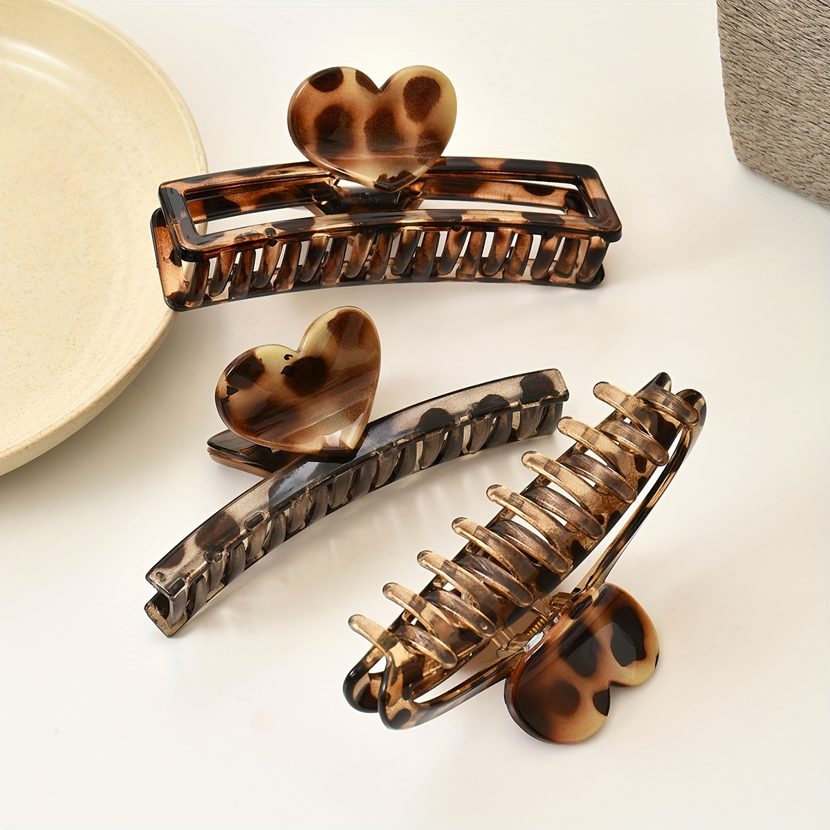 TEMU 3개 세트 우아한 표범 프린트 헤어 클로 클립 - 하트 악센트가 있는 대형 홀 디자인, 스타일리시한 업도 및 포니테일용 아크릴 샤크 클립, 업도 클립|슬릭 헤어 액세서리|아크릴 헤어 클립, 귀여운 헤어 클립