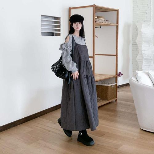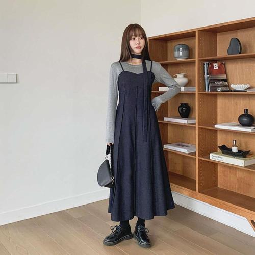 [다잇템]여성 롱 스트랩 울혼합 코르셋 후레아 드레스