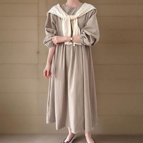 [옷자락]여성 일상복 등원복 브이넥 루즈핏 면 퍼프 롱드레스