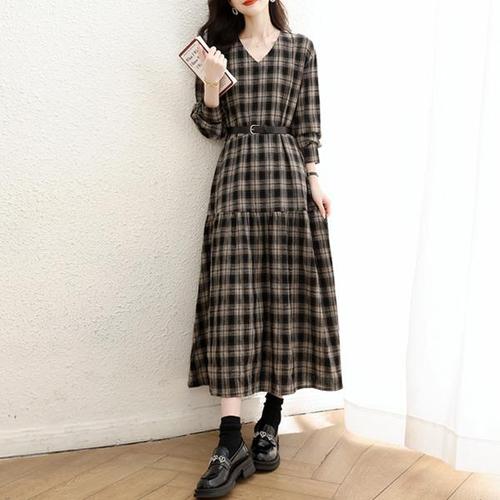 [패션이슈]딥체크브이넥벨트원피스 LU00154